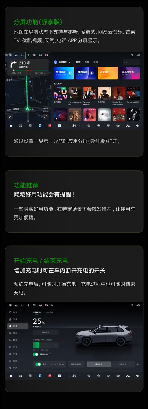 具体来看,在进行OTA升级后,零跑C10将新增离车供电模式、App远程OTA升级功能、人机共驾(智享版+智驾版)、ACC/LCC/NAC/NAP功能零车速启动、分屏功能(舒享版)、功能推荐、充电时车内断开充电开关等。