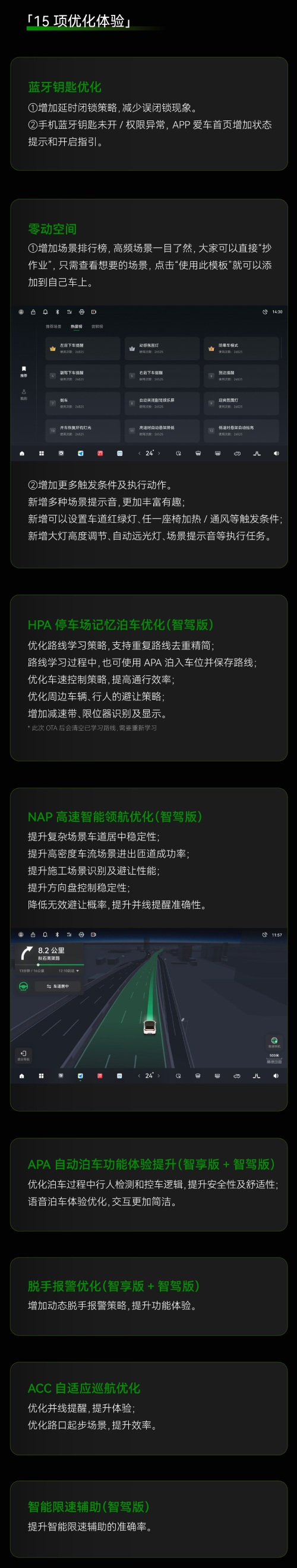 优化方面,此次OTA升级后,将对蓝牙钥匙、灵动空间、HPA停车场记忆泊车(智驾版)、NAP高速智能领航(智驾版)、APA自动泊车功能体验(智享版+智驾版)、脱手报警(智享版+智驾版)、ACC自适应巡航、智能限速辅助(智驾版)、整车声音策略、环视录制视频、语音大模型、音效大师、休憩模式(智享版+智驾版)、自动座椅加热/通风策略、App手机遥控器等功能进行优化。