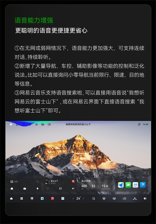 另外,语音方面将在无网或弱网情况下,支持连续对话;新增大量导航、车控、辅助影像等功能的控制和泛化说法;网易云音乐支持语音搜索。壁纸方面,AI壁纸新增收藏、编辑功能;新增3张壁纸盲盒;新增自定义壁纸功能。