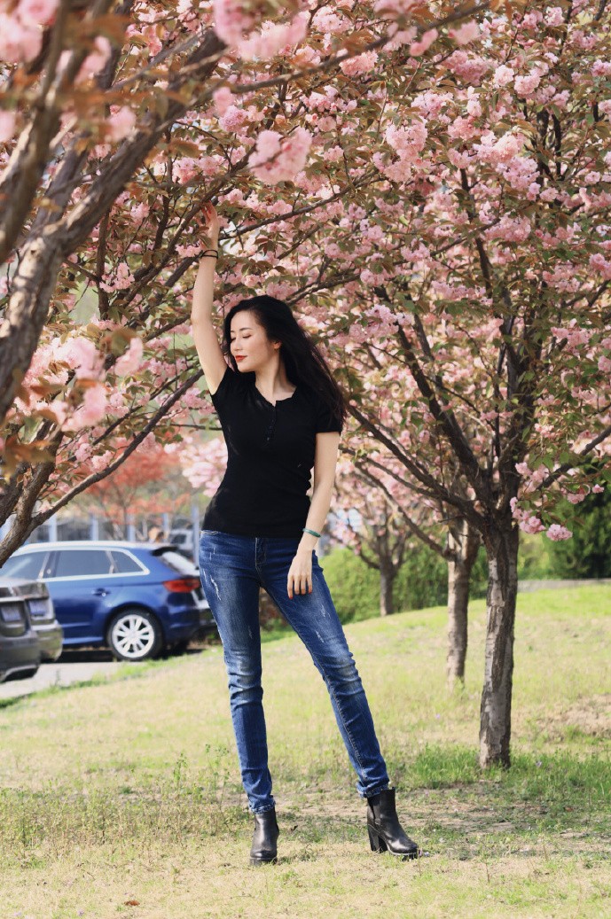 黑色的紧身小衫简洁百搭,下装搭配蓝色小脚裤青春又有活力。张彤搭配了黑色粗跟靴,演绎刚柔并济的美感。