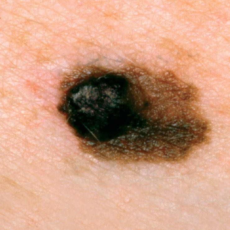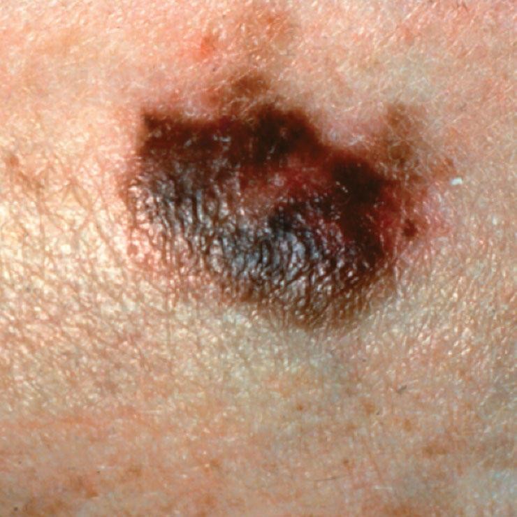 这种痣的形状虽还算对称,但颜色由黑色、褐色、红色和粉色混合而成。Schultz认为,它也有可能是黑色素瘤的信号。