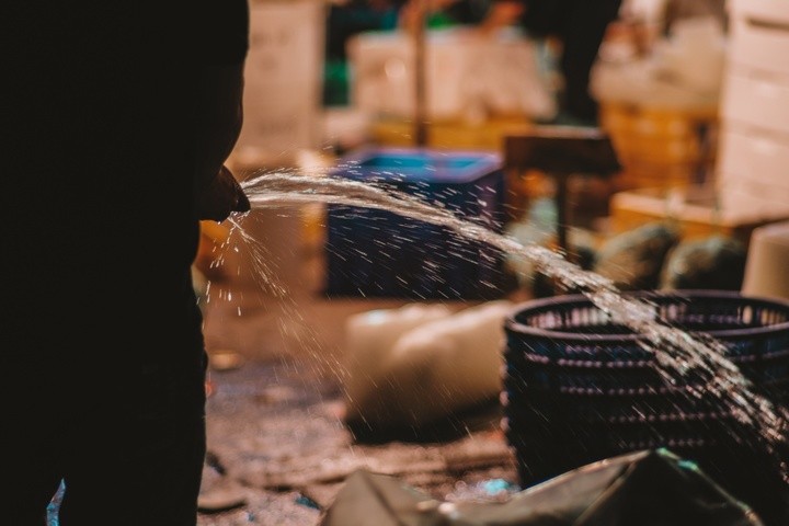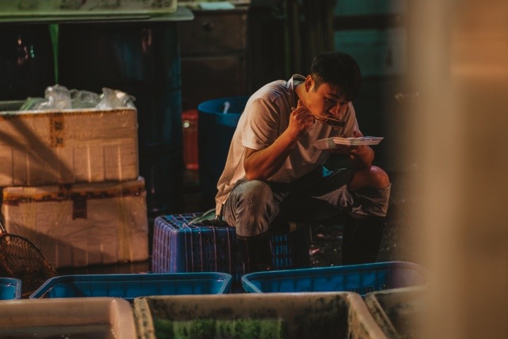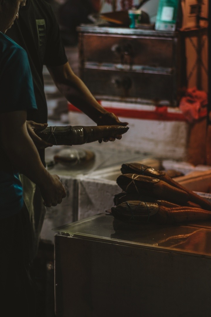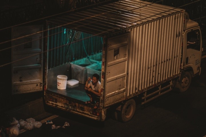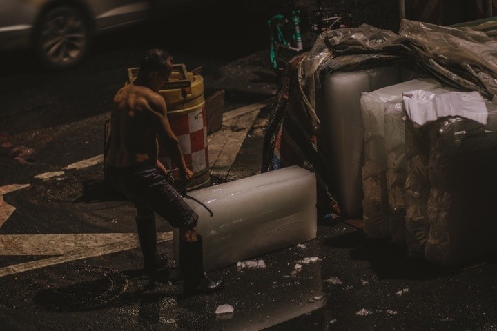 踏入黄沙水产交易市场,就会感受到这里湿漉漉的地面,空气中弥漫着水产的咸腥味,耳边不断响起货车的喇叭声和倒车声;工人穿着雨鞋,拉着手推车在路上灵活地游走,市场充满了浓浓的市井气息。一个工人正拖着一块冰块出来,这些冰块用来保鲜水产货物的。