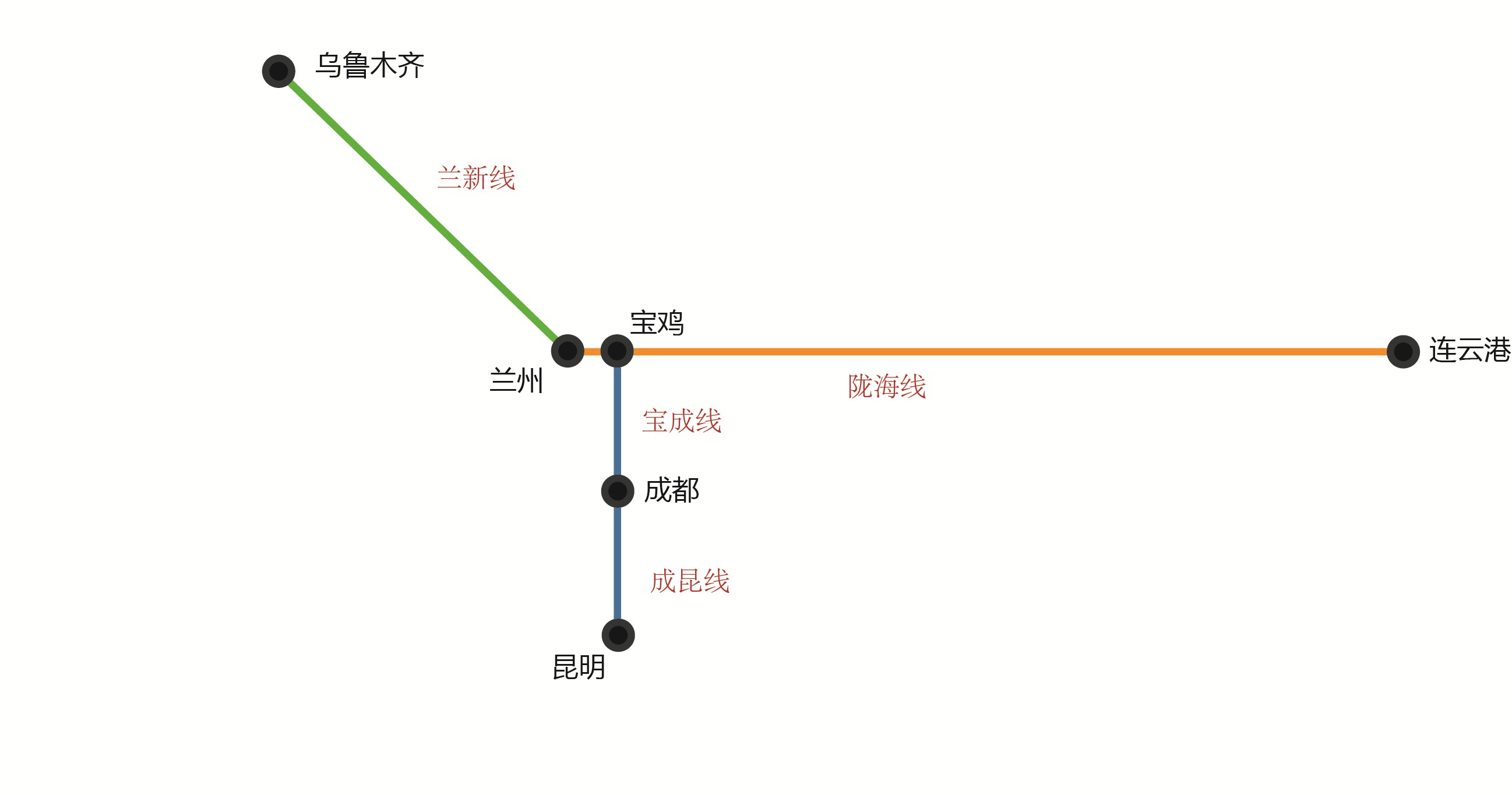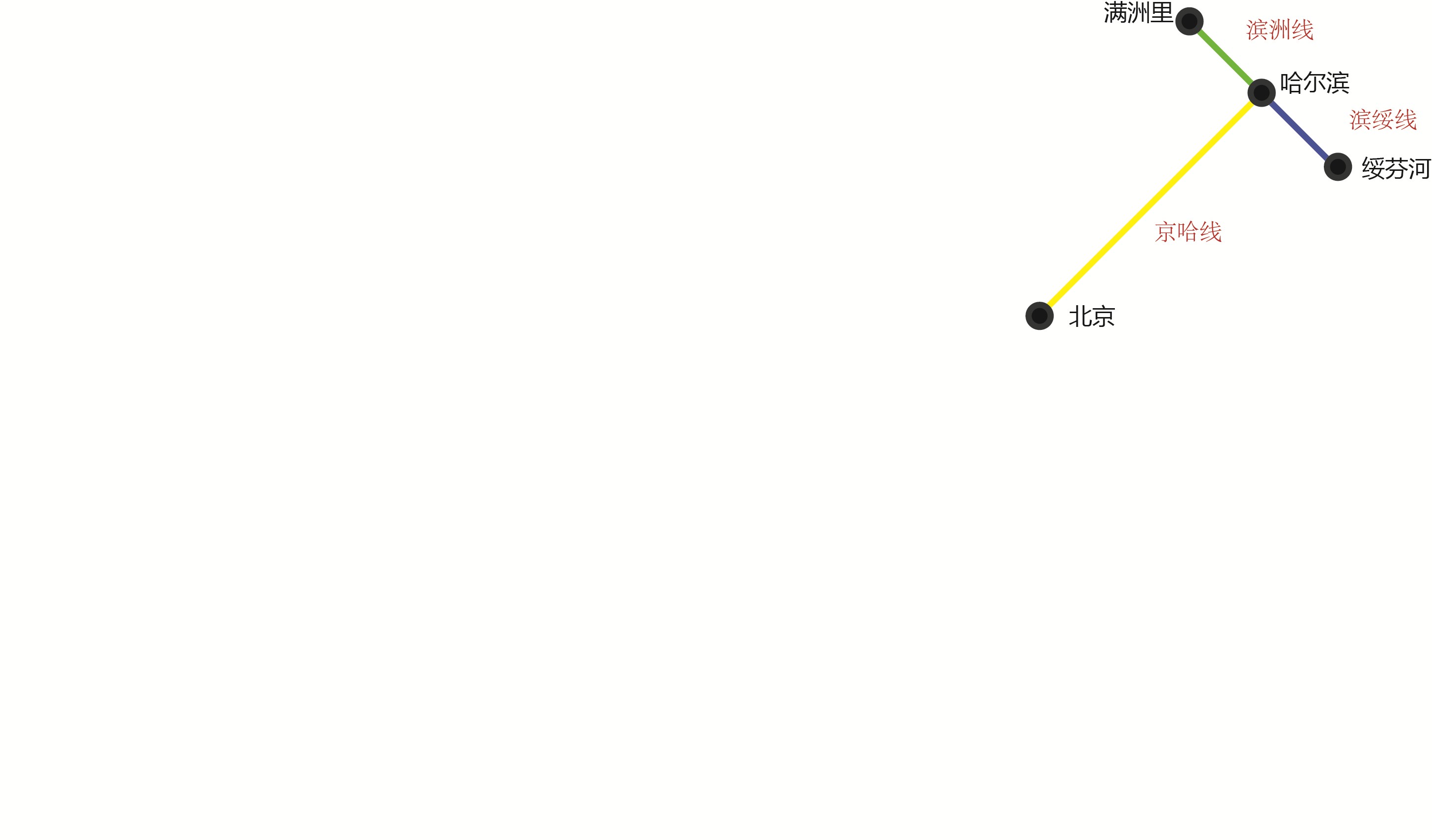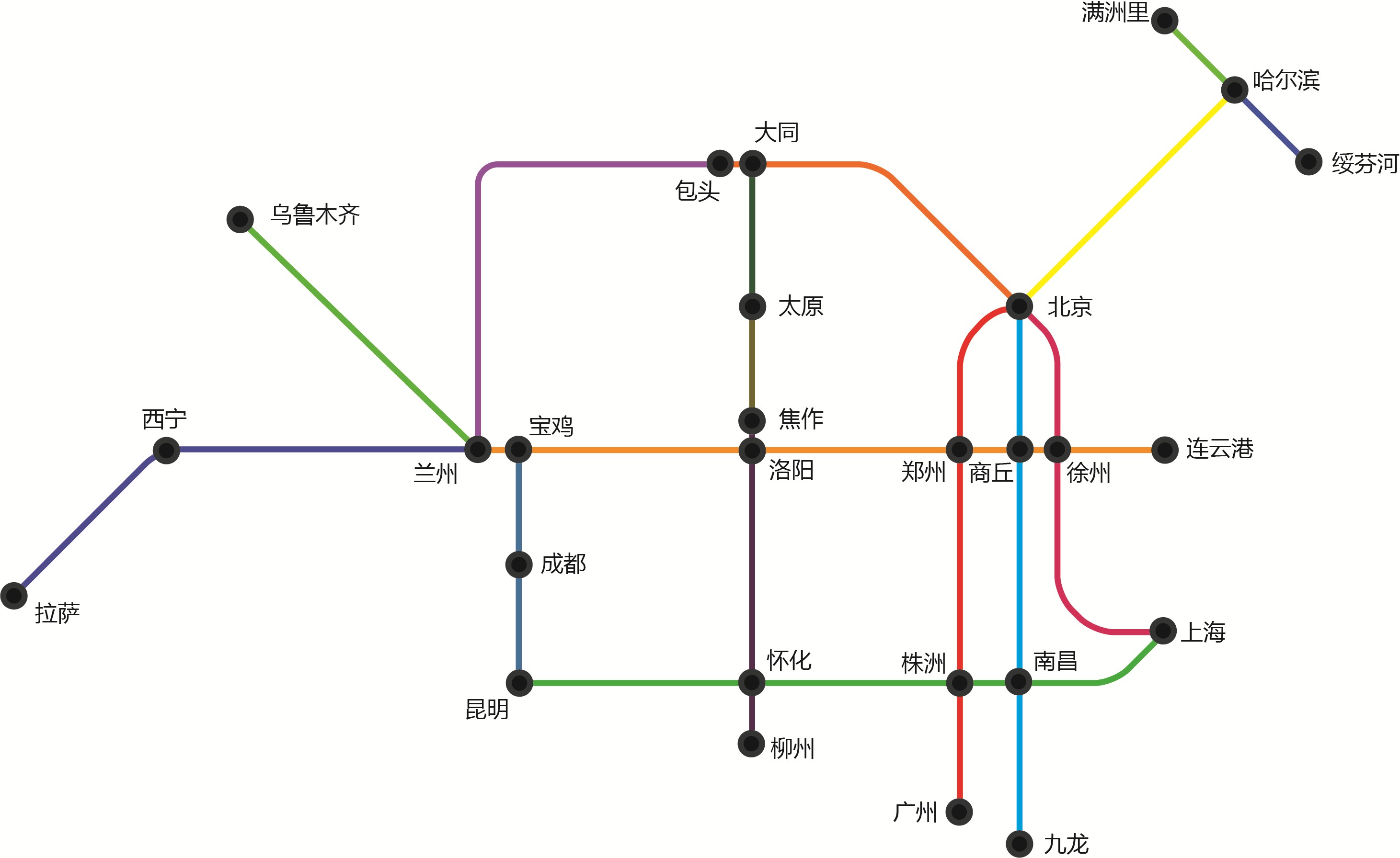 为了使得线路图简洁,通过类似地铁图的方式来画这几条铁路干线和主要铁路枢纽城市