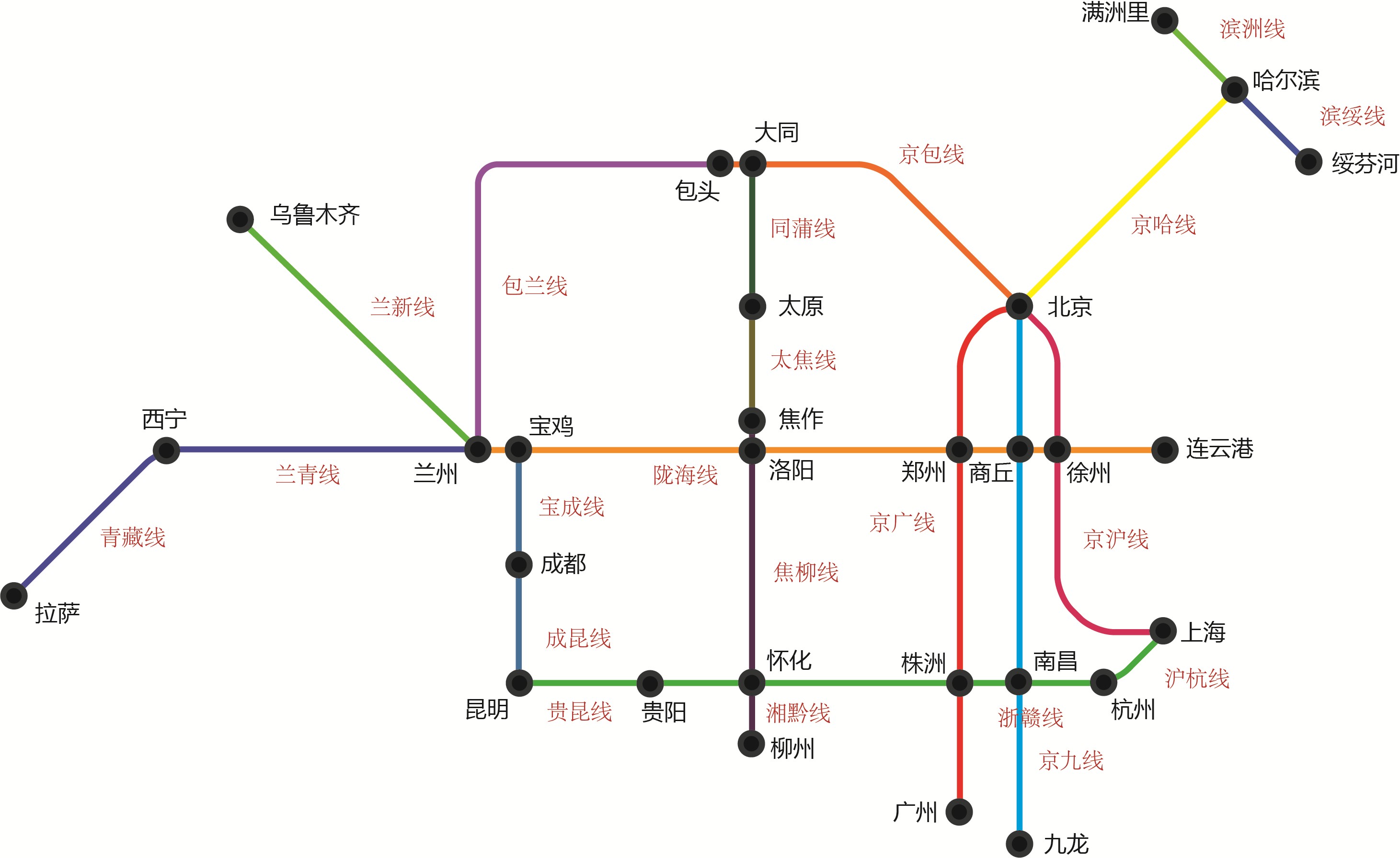 京哈——京广线、京九线、京沪线、北同蒲线——太焦线——焦柳线、宝成——成昆线、兰青——青藏线