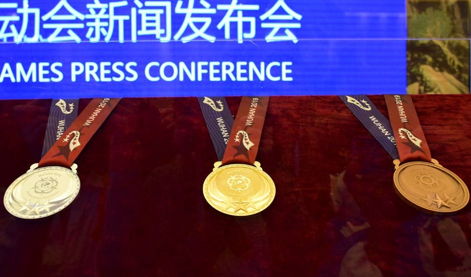 军运会奖牌、奖杯10日在武汉正式亮相。军运会奖牌名为“和平友谊之星”,除CISM(国际军体)标识和军运会会徽外,还融入五角星、翅膀、道路、赛跑的冲刺撞线带、长城、梅花、黄鹤楼建筑形象等视觉元素,凸显军事特色和中国文化元素。(图片来源:中新社)