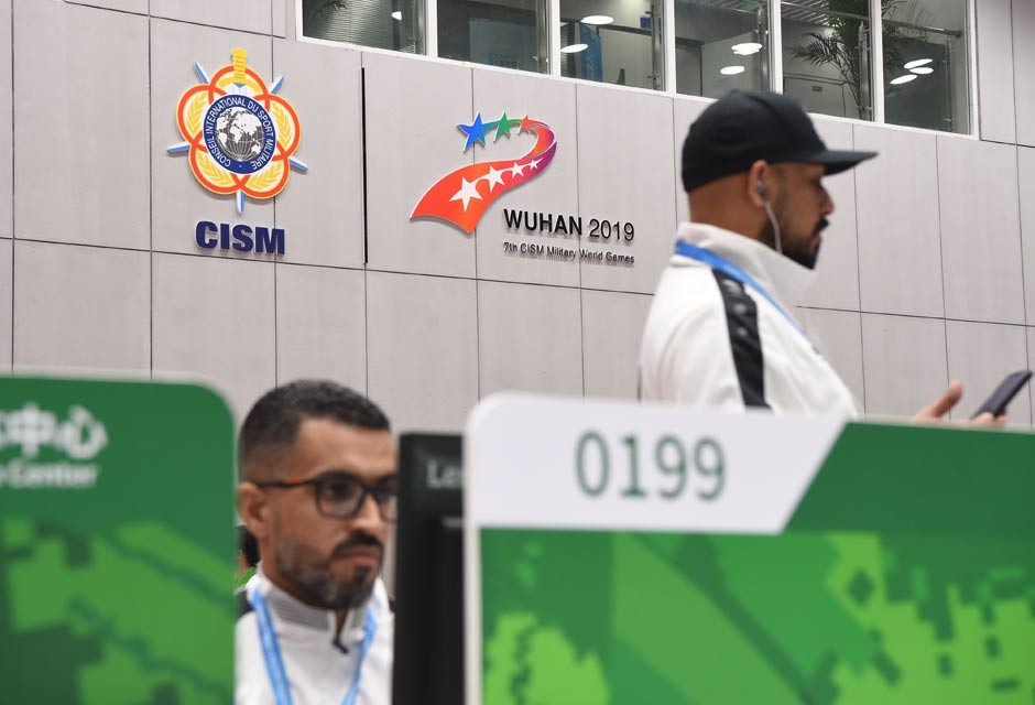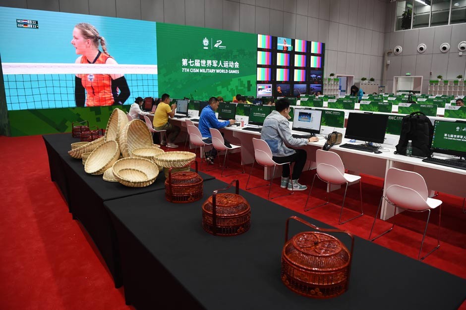 第七届世界军人运动会开幕式10月18日晚20时在武汉体育中心举行,中共中央总书记、国家主席、中央军委主席习近平将出席开幕式并宣布运动会开幕。在军运会开幕之际,一起“进村”去看看各项筹备情况。第七届世界军人运动会主媒体中心主体工程建筑面积43566平方米,地上四层、地下两层。公共媒体工作间设336个工位,分为文字记者和摄影记者工作区。图为巴林记者在公共媒体工作间工作。(图片来源:中新社)