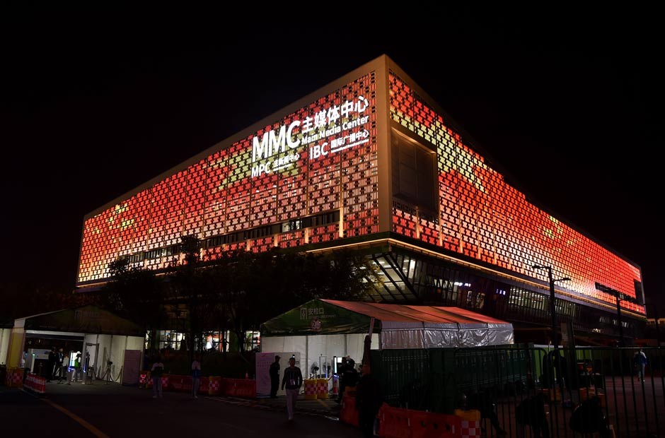 图为夜色中的主媒体中心外景。(图片来源:中新社)