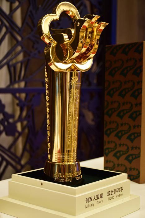 奖杯名为“腾飞”,以梅花、抽象的和平鸽为设计主元素,与军运会会徽的数字“7”、跑道、祥云图形组合构成。图为军运会奖杯。(图片来源:中新社)