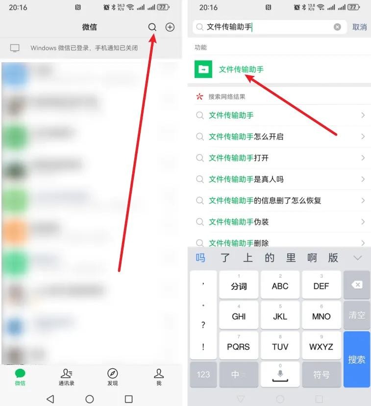 1、打开我们的微信,然后在聊天界面中点击右上角的【放大镜】,也就是搜索功能,接着输入【文件传输助手】,然后在搜索结果中的“功能”下方点击【文件传输助手】即可;