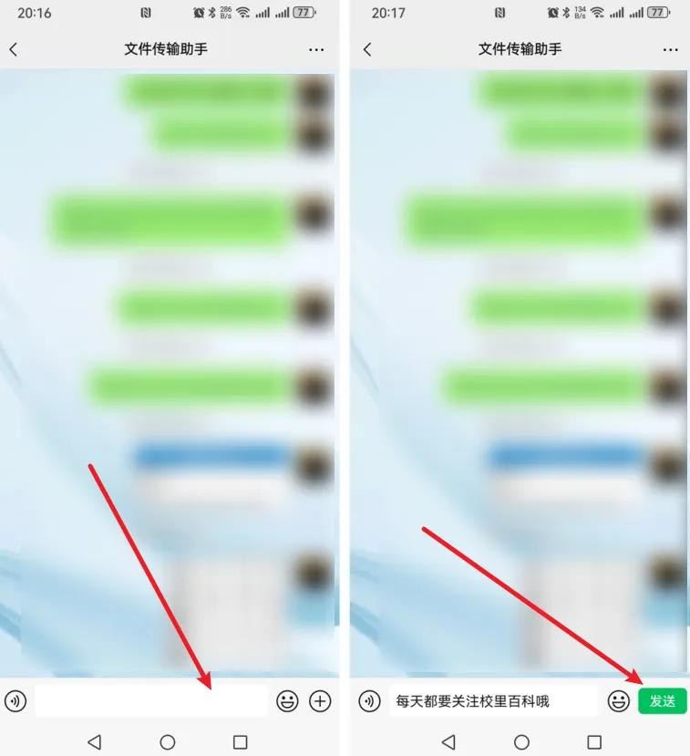 2、进入“文件传输助手”功能后,在下方聊天中输入自己想要传输的内容或者文件,小鹏以内容为例,写好内容后点击右侧的【发送】即可,如下图所示: