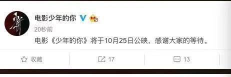 《少年的你》官方微博刚刚宣布定档10.25日。影片原定6月27日上映,但在6月24日突然宣布撤档,新档期待定。而早在今年年初,该片曾经入围柏林电影节新生代单元,但随后又突然宣布“因后期制作原因”无法参加柏林影展。