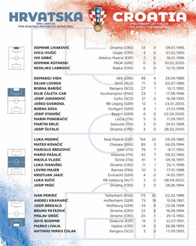 10月31日,克罗地亚公布大名单:莫德里奇领衔,佩里西奇、洛夫伦在列。
