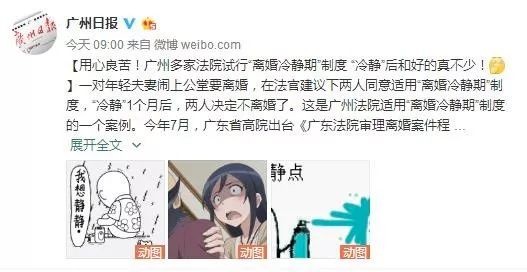 【用心良苦!广州多家法院试行“离婚冷静期”制度 “冷静”后和好的真不少!】一对年轻夫妻闹上公堂要离婚,在法官建议下两人同意适用“离婚冷静期”制度,“冷静”1个月后,两人决定不离婚了。这是广州法院适用“离婚冷静期”制度的一个案例。今年7月,广东省高院出台《广东法院审理离婚案件程序指引》,提出实施离婚冷静期制度。目前,广州多家法院正探索实行这一制度,其中广州南沙法院专门制定了操作规程,该院已有5宗离婚案件适用该制度,最终有3对夫妻经“冷静”后决定不离婚。