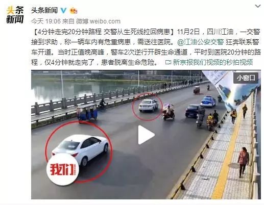 【4分钟走完20分钟路程 交警从生死线拉回病患】11月2日,四川江油,一交警接到求助,称一辆车内有危重病患,需送往医院。@江油公安交警 狂奔联系警车开道。当时正值晚高峰,警车2次逆行开辟生命通道,平时到医院20分钟的路程,仅4分钟就走完了,患者脱离生命危险。