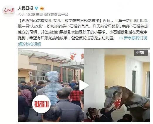 【爸爸扮恐龙接女儿 女儿:放学想有只恐龙来接】近日,上海一幼儿园门口出现一只“大恐龙”,扮恐龙的是小石榴的爸爸。几天前父母鼓励3岁的小石榴养成独立的习惯,并答应她如果做到就满足孩子的小要求。小石榴做到后在无意中提到,希望有只恐龙接她放学,爸爸便扮成恐龙去幼儿园。