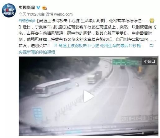 【高速上被钢板击中心脏 生命最后时刻,他将客车稳稳停住……】近日,宁夏客车司机撒东红驾驶客车行驶在高速路上,突然一块钢板迎面飞来,击穿客车前挡风玻璃,砸中他的胸部,致其心脏严重受伤。生命最后时刻,他强忍疼痛,将载有19名旅客的客车停在路边后,自己倒在驾驶室内……转发,送别英雄!