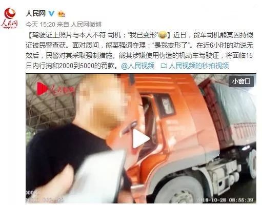 【驾驶证上照片与本人不符 司机:“我已变形”】近日,货车司机熊某因持假证被民警查获。面对质问,熊某强词夺理:“是我变形了”。在近6小时的劝说无效后,民警对其采取强制措施。熊某涉嫌使用伪造的机动车驾驶证,将面临15日内行拘和2000到5000的罚款。@人民视频