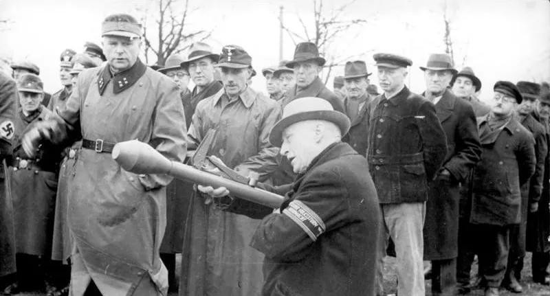 图5.正在接受“铁拳”反坦克武器使用训练的人民冲锋队老兵,照片摄于1945年春,战争后期德国人力资源的枯竭由此可见一斑