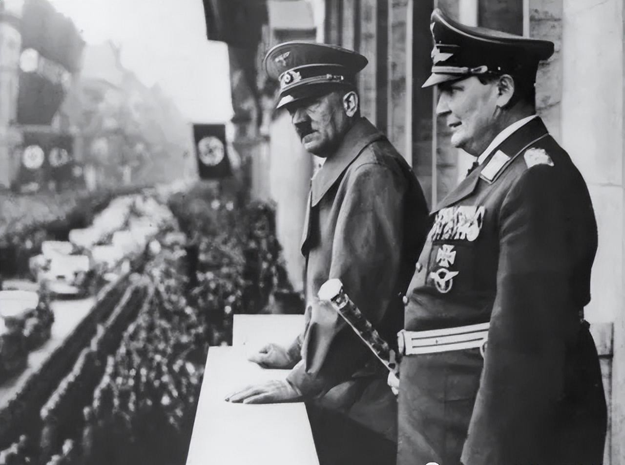 图4.希特勒和赫尔曼·戈林站在帝国总理府的阳台上检阅军队,照片摄于1938年