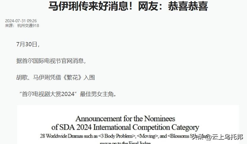 而文章的前妻马伊琍现在的事业也处于上升期,就在7月30日,根据首尔国际电视节官网消息显示,胡歌、马伊琍凭借《繁花》入围“首尔电视剧大赏2024”最佳男女主角。