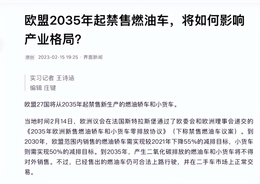 早在2021年欧盟就已经提出“禁售燃油车议案”,两年后欧洲议会通过了这项议案,表示欧盟将于2035年起禁售燃油车。