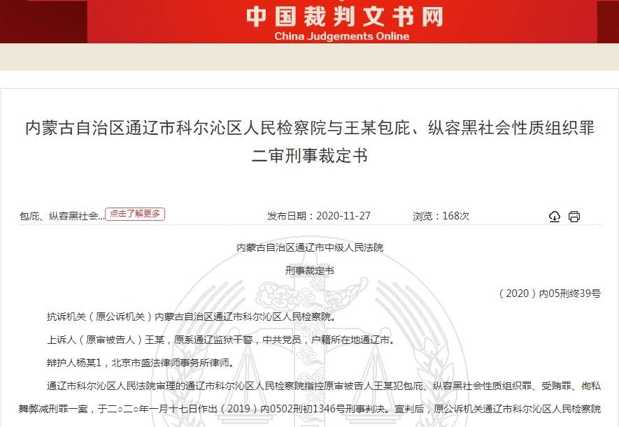 近日,裁决文书网公布了《内蒙古自治区通辽市科尔沁区人民检察院与王某包庇、纵容黑社会性质组织罪二审刑事裁定书》。裁定书披露,上诉人(原审被告人)王某,原系通辽监狱干警,中共党员,户籍所在地通辽市。