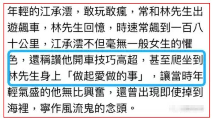 更刺激的还在后面,他们在一起之后,林某常常带着江承澐去飙车,车速飞快地飚至每小时180公里,没想到江承澐竟然不恐慌,反而夸奖他开车技术真牛,甚至直接爬上他的身体,"做那种事儿呢。"