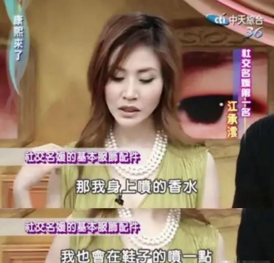 江承澐自己也毫不客气地说她每天都会给胸部擦价格极度昂贵的护肤液,肚子饿的时候就吃燕窝,这样的习惯已经坚持三十年了;还有,她收藏了800双名牌鞋子,甚至还要给每一双鞋子喷香水。这话是她自己在《康熙来了》说的。