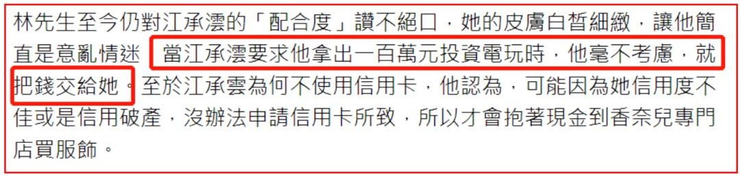 搞定林某之后,江承澐就找借口开了家小店,然后前后总共从男朋友那里套走了超过100万新台币的现金,真是财大气粗。已经昏了头的林某也没多想,直接就是乖乖掏钱。