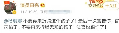 却不知道田亮在得到了孩子后,还得到了抚养费,没想到田亮拿了钱后,竟然翻脸不认人,他想要的更多,他开始不满足于区区的1万多块钱,反而以抚养权为由,不停的挑衅杨明娜,多次敲照勒索。