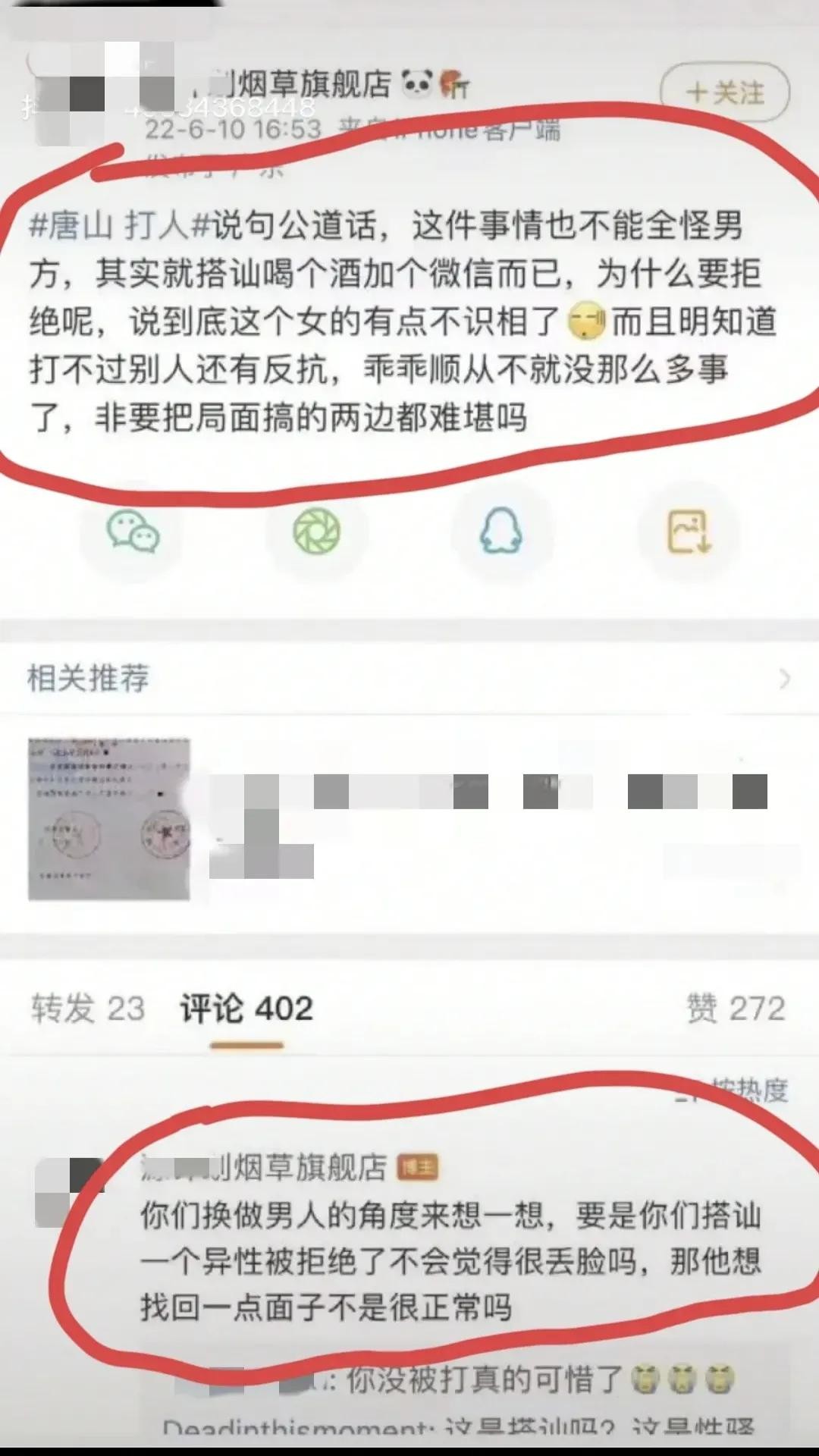 半夜吃烧烤的都是女流氓!被人骚扰反抗了就该被打死。真不知道她是个什么物种。这脑回路不仅仅是奇葩,已经完全进入超神经的病态范畴。