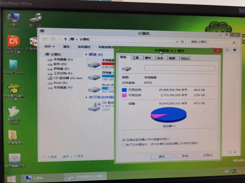 选择2 Win8 PE启动,进入到PE界面。双击“计算机”,右击“C盘”选属性,一看果然是压缩了磁盘,去掉“✓”,确定。然后电脑就会解压缩C盘,有跳出窗口选“忽略”。这一过程要几分钟,耐心等待。重启,大功告成。