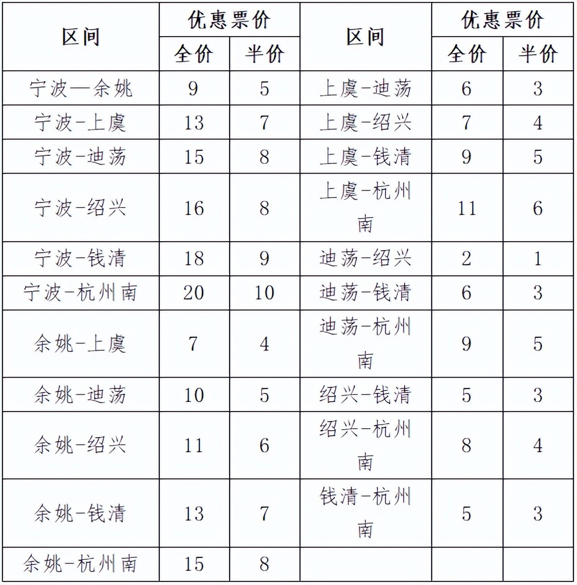 其中,宁波至杭州南站全程票价为20元,半票为10元;余姚至杭州南站全程为15元,半票为8元。