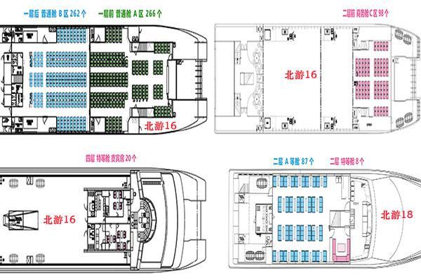 大快船北游12和北游16,载客量在1000人左右,航行时间70分钟,主要分别为普通舱、商务舱和特等舱。 普通舱分成A、B、E三个区(A区一楼船头、B区一楼区船尾、E区三楼船尾),价格为150元/人;商务舱分为C、D两个区(C区二楼船头、D区三楼船头),价格180元/人; 特等舱(四楼船头)价格为240元/人。
