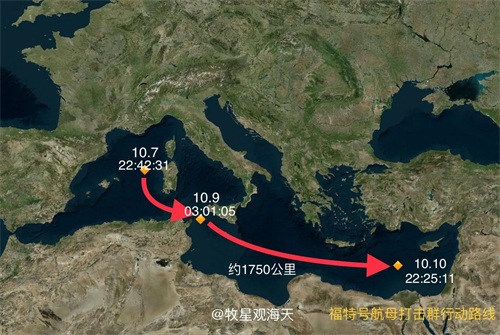 10月7日巴以冲突爆发后,美军立即采取了行动,第一个大动作就是让“福特”号航母战斗群火速赶往以色列周边海域。实际上在冲突爆发之前“福特”号已经位于地中海,只不过是在地中海西部靠近意大利和法国的海域,美国海军下达命令后“福特”号航母战斗群于10月7日晚上紧急出发,于10月10日晚上抵达了以色列周边的地中海东部海域,72个小时内航行了接近2000公里,成功完成了美国海军下达的部署任务。
