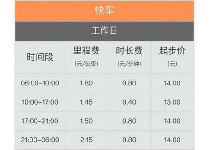 此次调价除10:00到17:00时段外,滴滴快车起步价均从13元上涨至14元。里程费调整到1.45元至2.15元。其中,21:00到次日6:00的里程费上调至2.15元/公里。