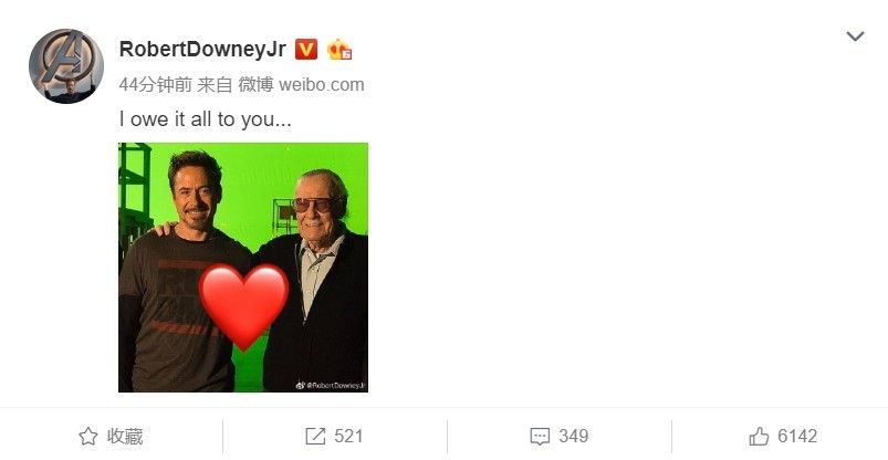 “钢铁侠”小罗伯特·唐尼除了在11日领取2019人民选择奖“年度电影男明星”时,表示要将此奖献给斯坦·李之外,也于今日(北京时间11月13日)在微博发文缅怀,“这一切都归功于您”,并晒出两人互相搭着肩膀合影。