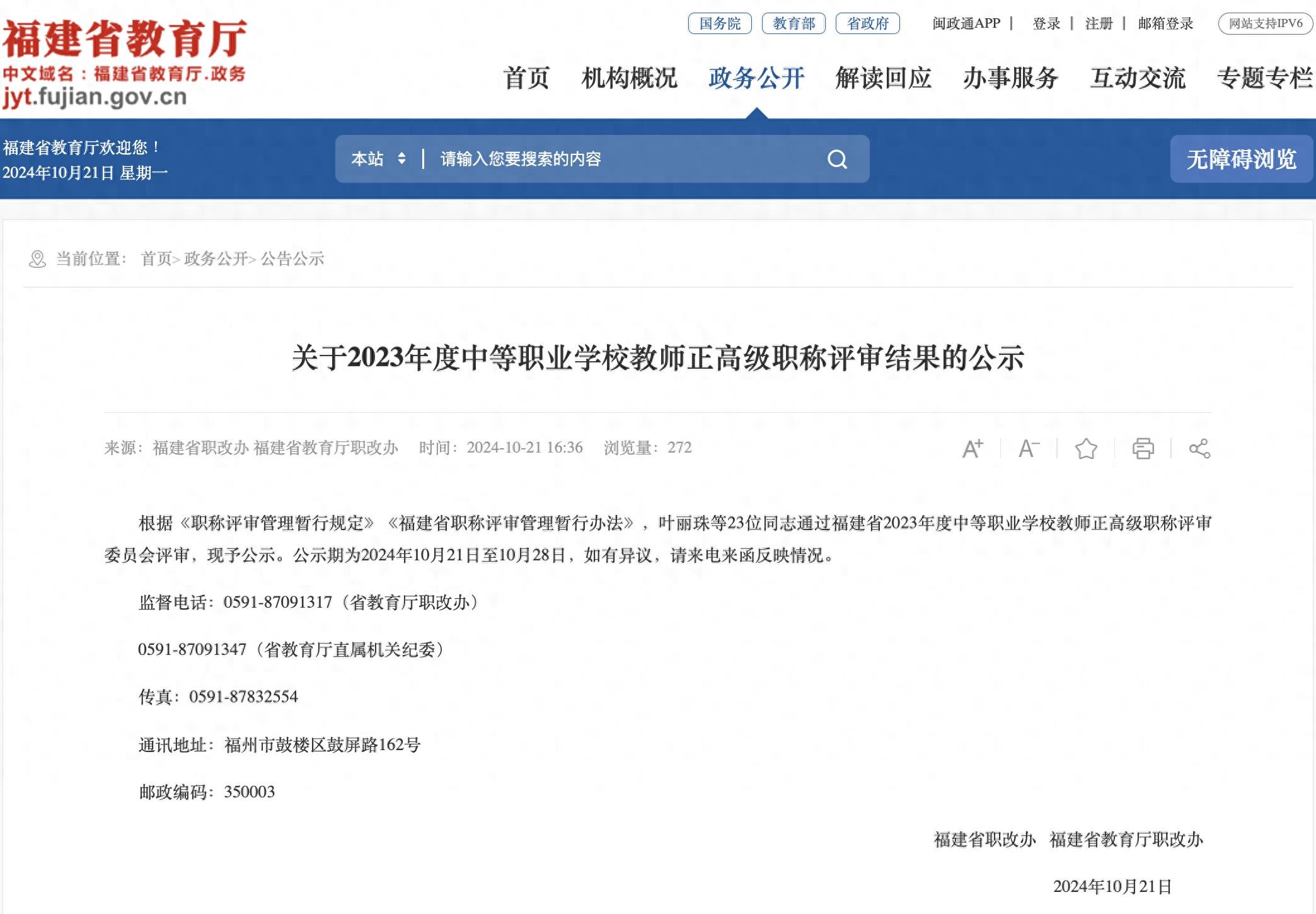 根据《职称评审管理暂行规定》《福建省职称评审管理暂行办法》,叶丽珠等23位同志通过福建省2023年度中等职业学校教师正高级职称评审委员会评审,现予公示。公示期为2024年10月21日至10月28日,如有异议,请来电来函反映情况。