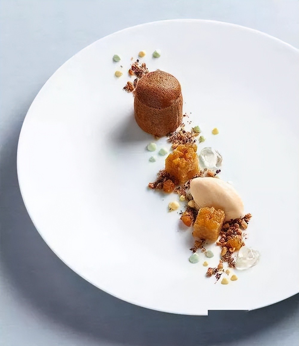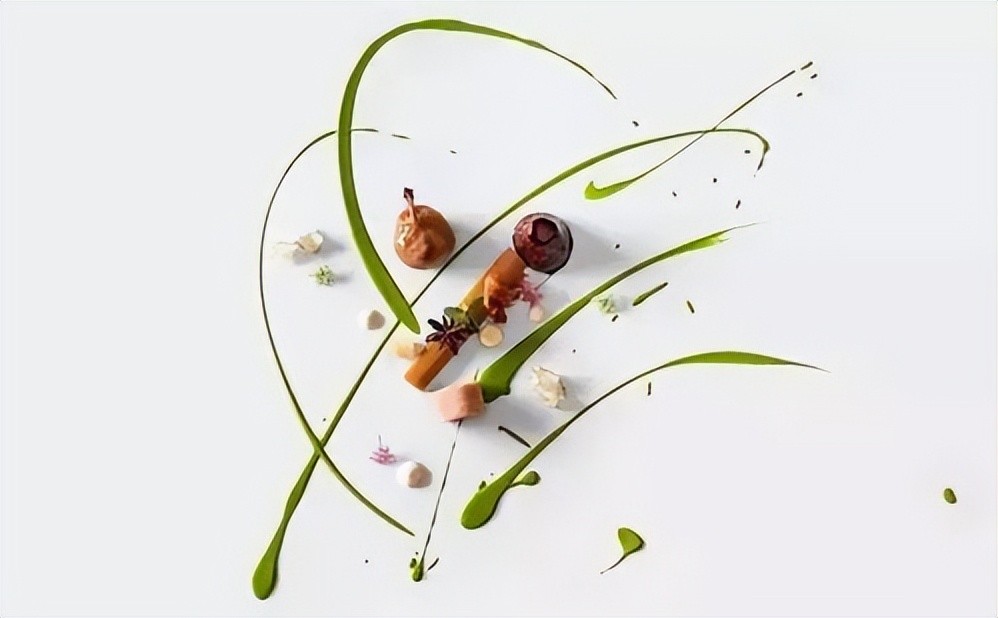 弧线是中餐里面很好用的一种摆盘效果,如果你觉得盘子里的菜看起来太方方正正,笨重的时候,用酱汁画弧线吧,保证