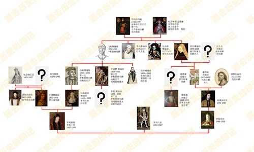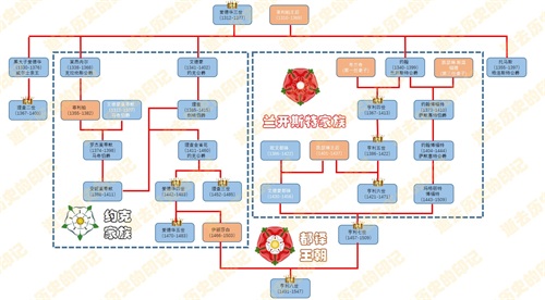 从上面的王位关系图谱里可以看出,亨利八世最终是继承了约克家族与兰开斯特家族共同的血脉,但是下面有一个更有趣的血脉图谱。
