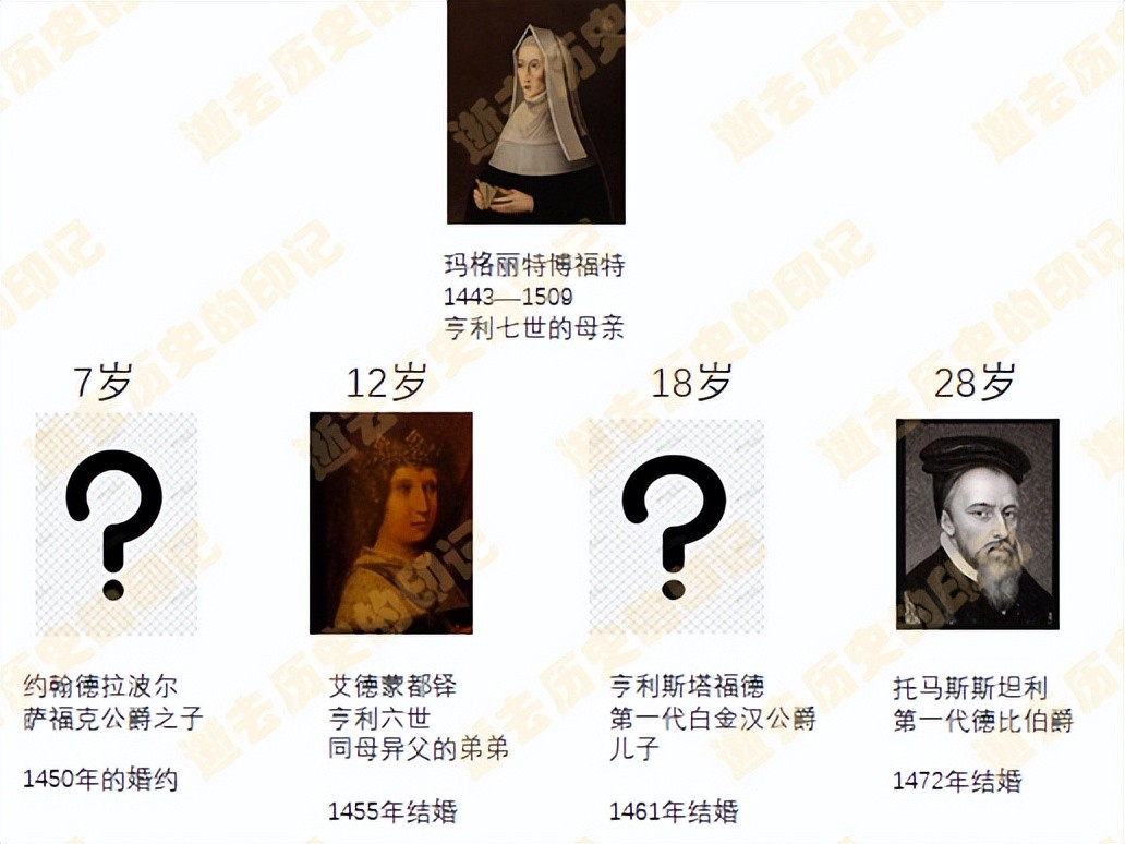 玛格丽特博福特1443年5月31日出生,父亲约翰博福特在1444年死亡,由于她是唯一的孩子,所以她成为了父亲财产和领地的唯一继承人(爵位被叔叔继承),年仅七岁她就被许配给了当时他的宠臣萨福克公爵德拉波尔的儿子约翰,三年后这段婚姻被解除。亨利六世又把她许配给了艾德蒙都铎,也就是亨利六世同母异父的弟弟。