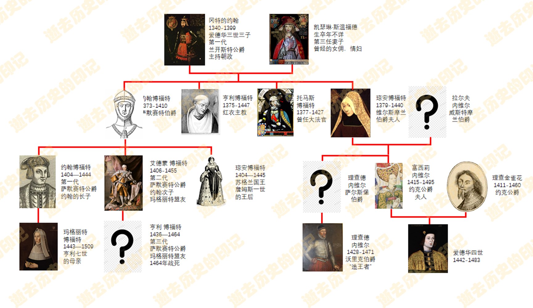 约翰博福特被封为萨默赛特伯爵,他的长子(也叫约翰博福特)继承了伯爵的位置,不久被册封为公爵,约翰博福特公爵直到1441年才结婚,唯一的女儿就是玛格丽特博福特郡主,出生于1443年,而1年后,约翰就因病去世了,爵位改由弟弟艾德蒙博福特继承,即那位让两个王后都痴迷的第二代萨默塞特公爵。而冈特的约翰的女儿琼安博福特则嫁给了拉尔夫内维尔,前面说沃里克公爵时提到过,琼安博福特的其中一个儿子是沃里克伯爵的父亲,最小的女儿是约克公爵理查金雀花的妻子,是爱德华四世的亲妈。