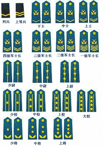 - 志愿兵役制士兵:一级军士长、二级军士长、三级军士长、四级军士长、上士、中士、下士;
