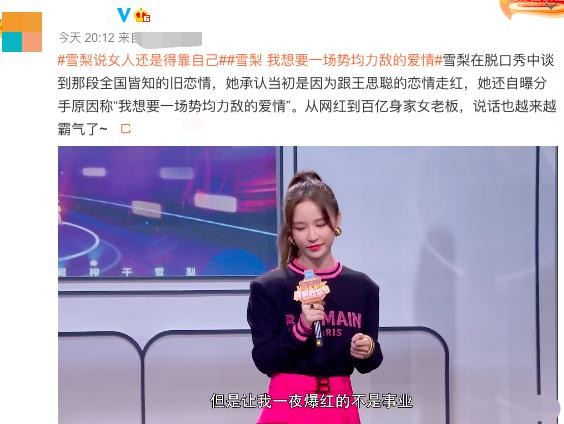 随后雪梨解释了自己和王思聪分手的原因,其实并不复杂,她想要一场势均力敌的爱情,但是发现敌不过。