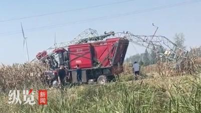 收割机撞倒铁塔,司机在驾驶室中殒命。(来源 / 网传视频截图)
