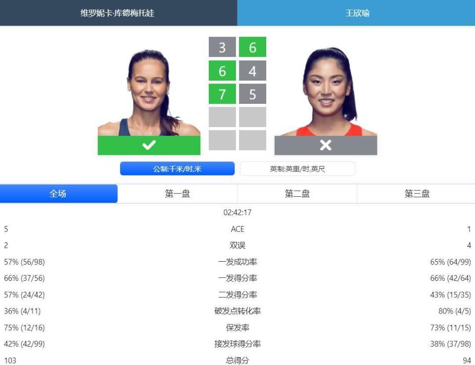 首盘王欣瑜在第 5 局率先破发,对手在第 6 局完成了回破。第 7 局和第 9 局比赛,王欣瑜又先后两次破掉了库德梅托娃发球局,6-3 赢下了第一盘比赛的胜利。