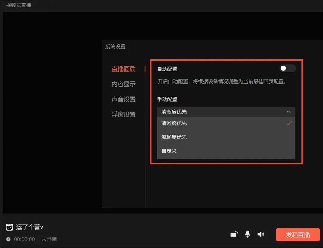视频号直播的设置里新增了自动配置,如果关闭了自动配置,依然可以手动设置直播码率、帧率和分辨率等,用户可以根据自身的硬件和网络条件,设置更好的直播效果。
