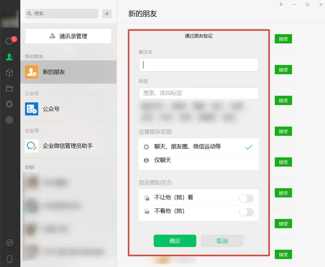 通过好友验证界面和手机版实现操作一致,在电脑端通过好友验证时,也可以直接设置好友备注名、标签和好友权限等。