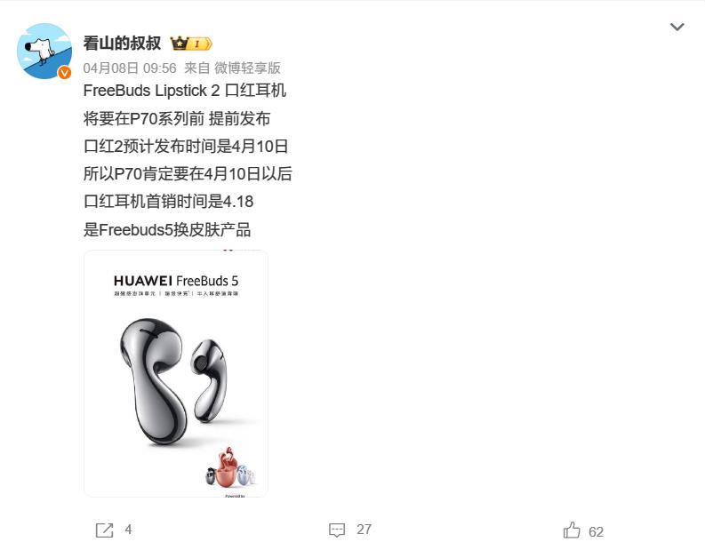 而在昨日,博主 " 看山的叔叔 " 曾发文透露,FreeBuds Lipstick 2 将在 P70 系列手机之前发布,预计发布时间为 4 月 10 日,首销时间为 4 月 18 日," 是 FreeBuds 5 的换皮肤产品。"