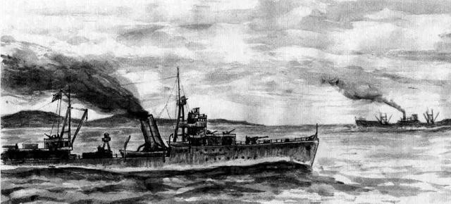 宁海号轻巡洋舰在努力躲避炸弹